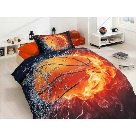 Комплект с объёмным рисунком Basketball выполнен в ярких тонах. На пододеяльнике и наволочке изображён большой баскетбольный мяч в окружении пламени.