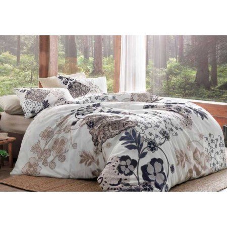 Модель "Bertha V01 Kahve" выполнена в кофейных тонах. Простынь бежевая однотонная. Пододеяльник белый с синими и коричневыми рисунками.