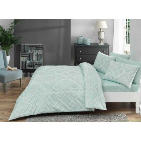 Модель "Celia Mentol" выполнена в голубых тонах. Простынь однотонная. Пододеяльник и наволочки с чуть светлым узором