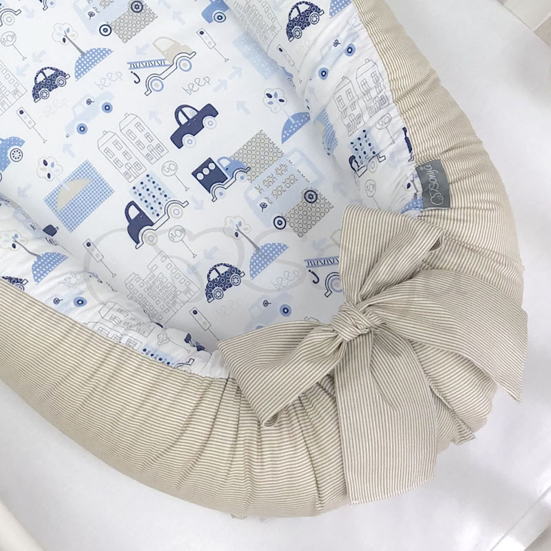 Модель «City» из серии Беби Дизайн Премиум выполнена с одной стороны в бежевом цвете, а с другой в бело-голубом с изображением машинок.