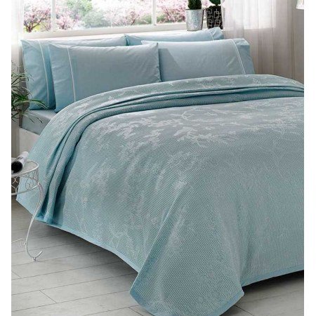 Модель Claire Turkuaz Бирюзового цвета с мелким выдавленным узором на покрывале. Предлагается с простынёй на резинке.