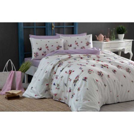 Модель "Claude V04 Lila" выполнена в светлых тонах. Простынь и нижняя часть пододеяльника фиолетовые однотонные. Верх пододеяльника белый с маленькими красными и синими цветочками.