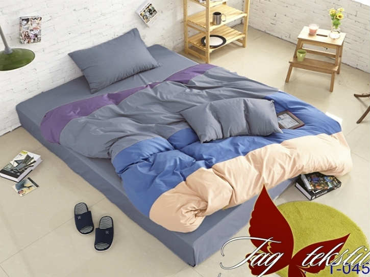 В то время, как простыня, наволочка и низ пододеяльника пошиты из однотонного синего поплина, яркий красочный верх пододеяльника сшит из четырёх частей синего, розового и фиолетового цветов.