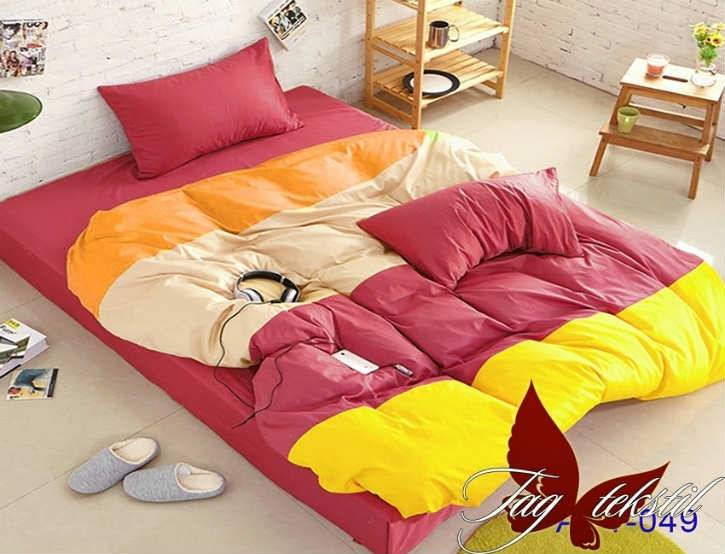 В то время, как простыня, наволочка и низ пододеяльника пошиты из однотонного синего поплина, яркий красочный верх пододеяльника сшит из четырёх частей оранжевого, бежевого, бардового и желтого цветов.