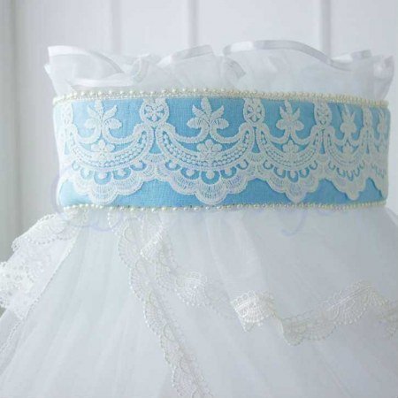 Модель «De Lux Blue» украшена изящными кружевами и красивым ажурным каркасом нежно-голубого цвета, обшитым перламутровыми бусинами.