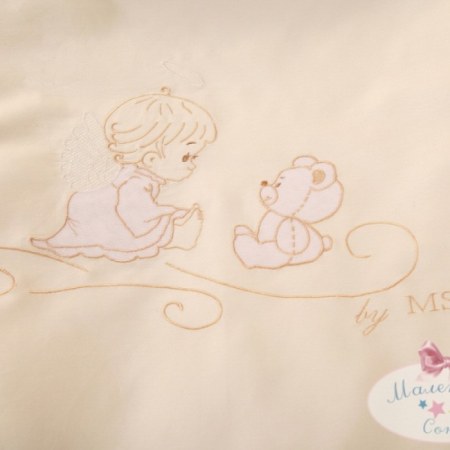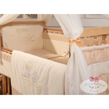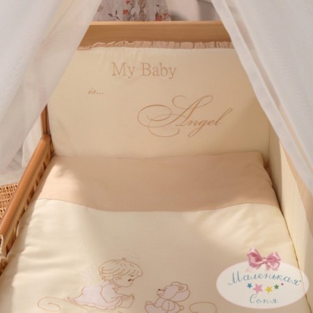 Модель "Ангел" выполнена в нежных светлых тонах коричневого цвета с лёгким шоколадным оттенком. Пододеяльник украшен красивой вышивкой. Она изображает маленьких ангелочка и медвежонка, которые переглядываются между собой и о чём-то тихо шепчутся.