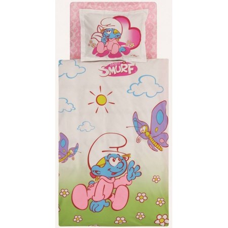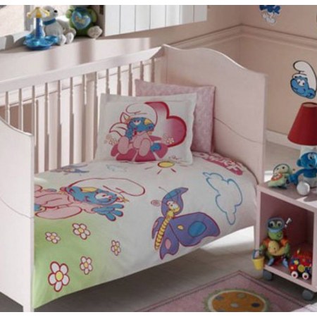 Комплект в кроватку «Sirinler Girl» с весёлыми Смурфиками производится исключительно из натуральных тканей.