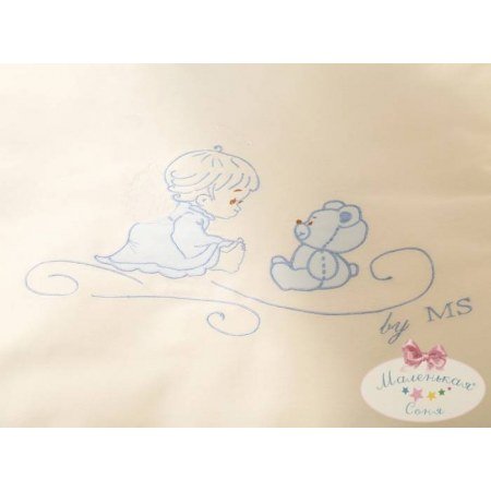 Комплект "Ангел" нежного голубого цвета имеет прекрасную объемную 3D вышивку маленького любопытненького ангелочка и его друга медвежонка, с которым они переглядываются и о чем-то тихо шепчутся.