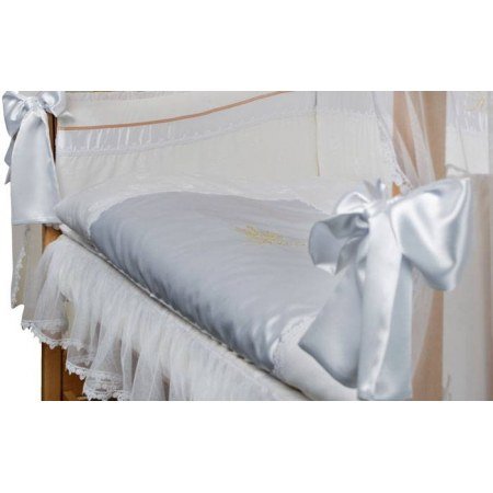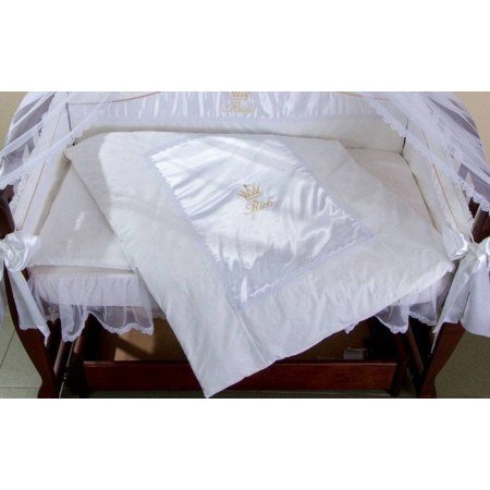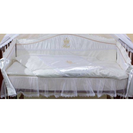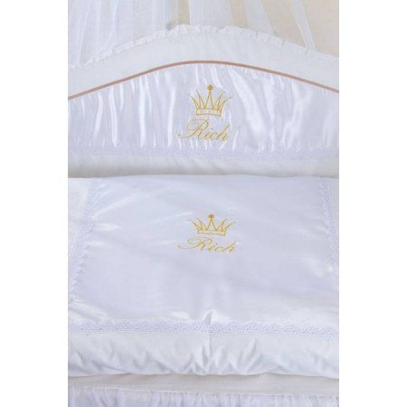Сменое постельное бельё в кроватку для новорожденных украшено вышивкой "Rich" с короной на атласе, атласными лентами, камнями Swarovski, которые в лучах света играют всеми цветами радуги. Дополнением являются объемные прекрасные кружева.