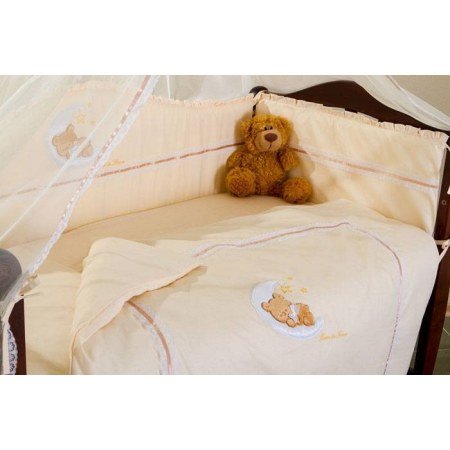 Оригинальный нежный комплект сменного постельного белья в кроватку "Тедди" выполнен из ранфорса и имеет прекрасную объёмную 3D-вышивку нескольких вариаций мишек: мишка-девочка на подушке, мишутка с кубиками, спящий медвежонок на луне. Кроме того, пододеяльник украшен двухсторонним гладким кружевом со светло-шоколадной лентой.