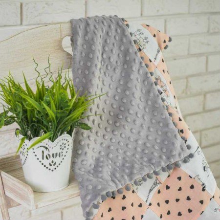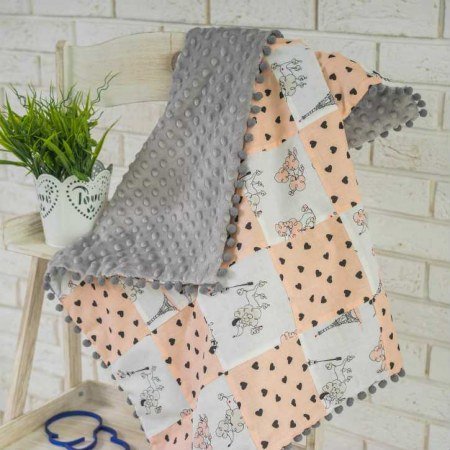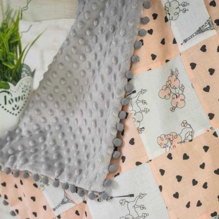 Модель Minky "Пудели" двусторонняя: с одной стороны изделие из натуральной хлопковой ткани, сшитой лоскутками в стиле пэчворк, а с другой - мягкая плюшевая подкладка из польской ткани серого цвета.