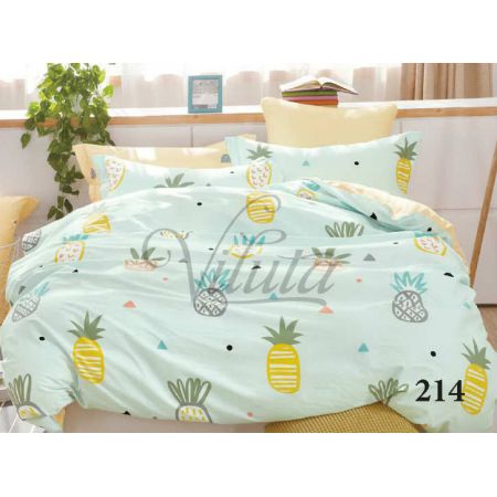 Одна сторона двухстороннего пододеяльника и простыня пошиты из ткани сливочного цвета, а вторая, как и наволочка, с ананасами на фоне ментолового оттенка.