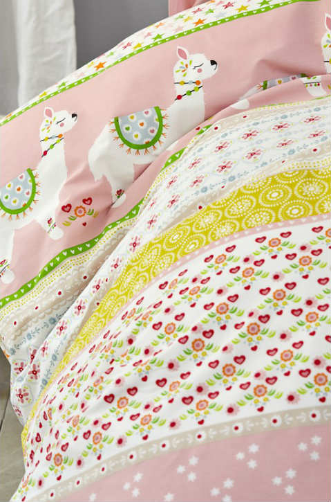 Модель "Arlina Pembe" для девочки выполнена из натурального хлопка с ламами на розовом фоне.