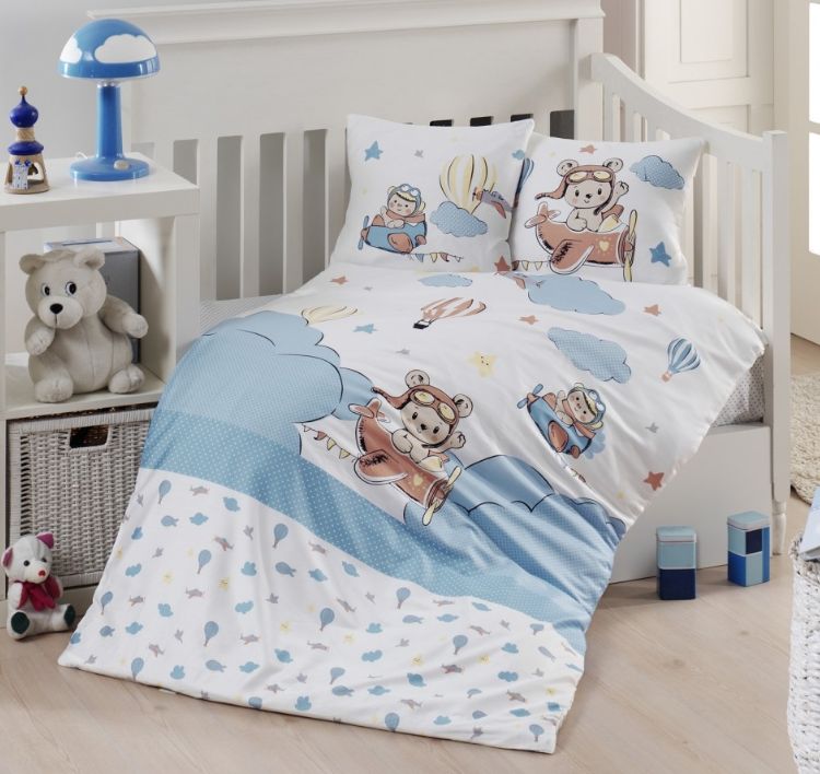 Нежные пастельные оттенки голубого в сочетании с белым цветом не будут раздражать нервную систему малыша. Авиа-тематика сделает комплект любимым для маленького лётчика.