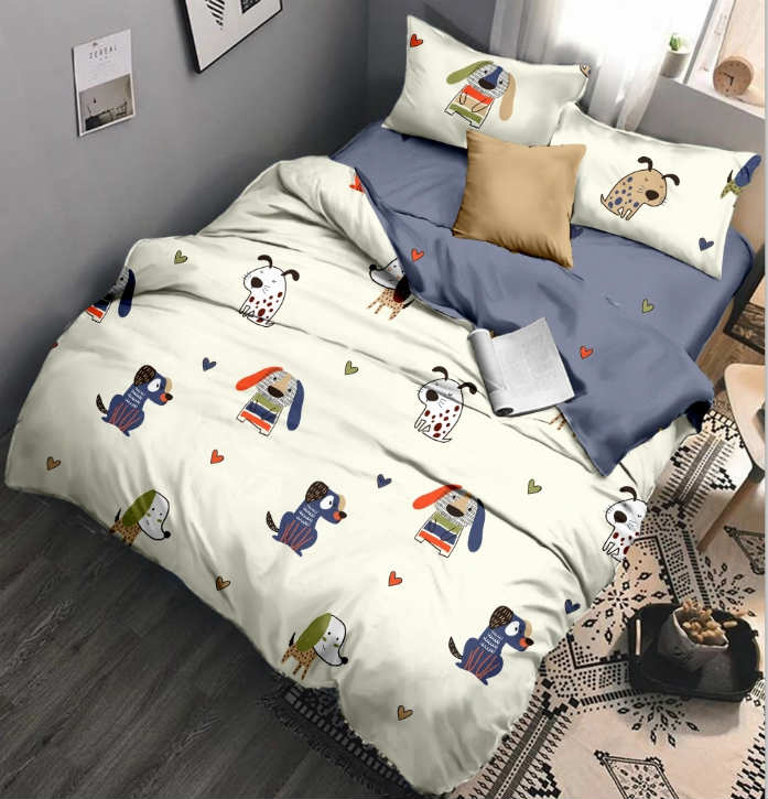 У модели ST 260 Малыш простынь и низ пододеяльника тёмно-синие, а верх с наволочками - с собачками на молочном фоне.