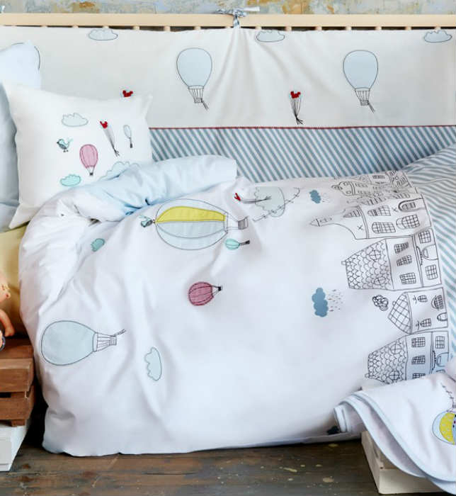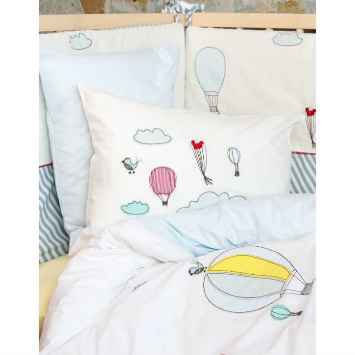 Модель "Balloon" для мальчика выполнена из натурального хлопка. Пододеяльник украшает аппликация воздушного шара на нежно голубом фоне.