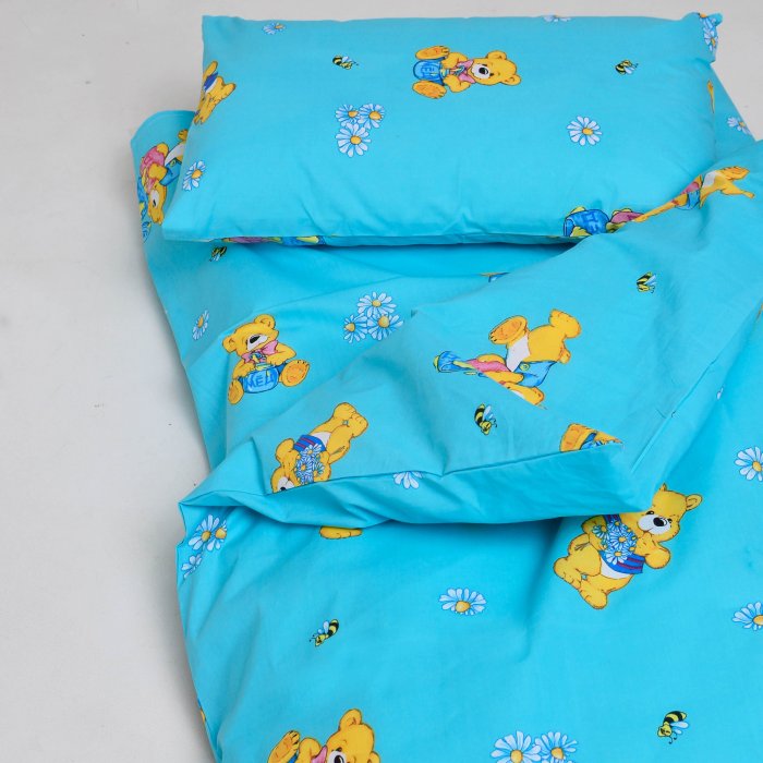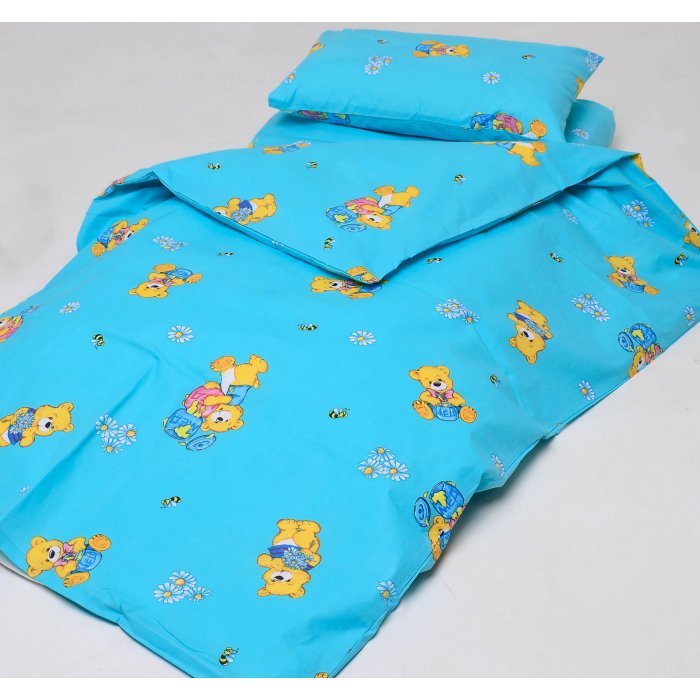 Постельныё комплект "Медвежата" (арт. 6112) пошит из ранфорса, что является одним из разновидностей плетения 100 процентной хлопковой ткани и представлен в четырёх цветах: голубой, зелёный, розовый и жёлтый.