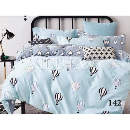 Модель "В воздухе" выполнена в голубых тонах с изображением летящих воздушных шаров с одной стороны пододеяльника и сердечек на сером фоне - с другой.