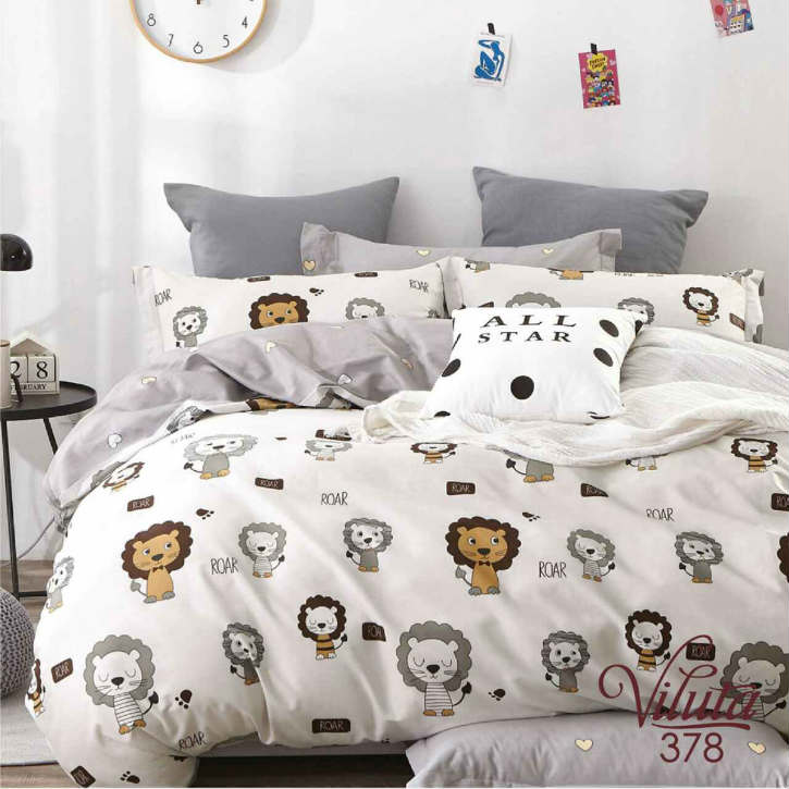 Модель 378 - двухсторонняя с тканью компаньоном. Одна сторона пододеяльника серая, вторая белая с львятами.