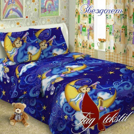 Комплект Звездочёт выполнен в ярких синих тонах с изображением жёлтого полумесяца с сидящим на нём мишкой-звездочётом. Данный набор подойдёт как девочкам, так и мальчикам.