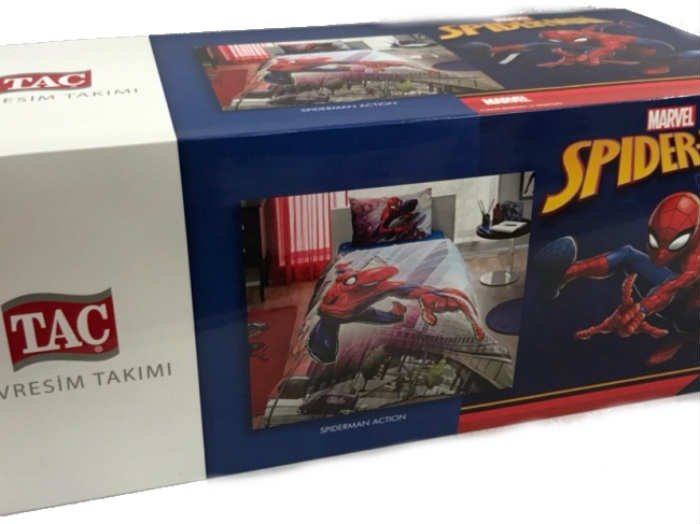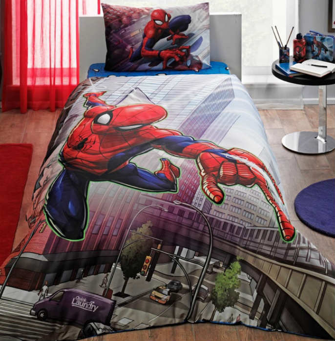 Модель SpiderMan Action с изображением человека паука, пролетающего над городом. Производится из натурального хлопкового материала.