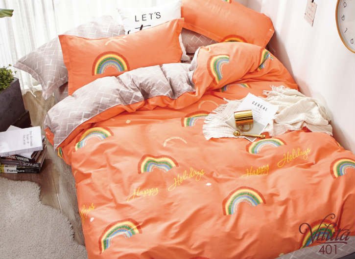 Модель 401 окрашена в сиреневые и оранжевые цвета с изображением радуги на пододеяльнике.