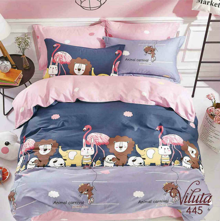 Модель 445 с дикими животными (львы, фламинго, зайцы, слоны) шьётся в полуторном размере на односпальную кровать.