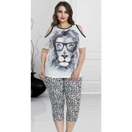В набор входят бриджи чёрно-белой леопардовой расцветки и белая футболка с принтованным львом и открытыми плечами.