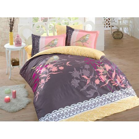 У набора Emilia Kahve желтая простынь и низ пододеяльника, а верх коричневый.