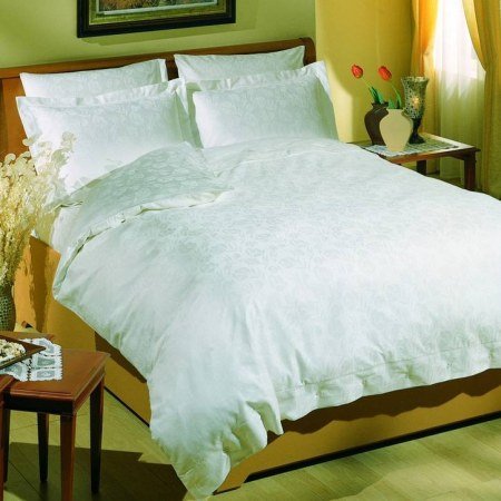 Элитное постельное бельё евро размера «Yakaranda»выполнено в чистом белом цвете из жаккарда - это плотная ткань с крупным узором. При этой технологии тканого переплетения рельефный рисунок вплетается в основу. Количество нитей как основы, так и утка может достигать нескольких сотен, ткань выполняется на специальных жаккардовых ткацких станках. Жаккард отличается от обычного сатина своей прочностью и долговечностью.