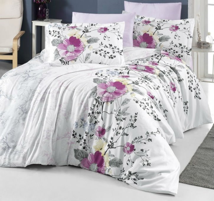 Модель Gilda белая с сиреневыми цветами. Вместо обычных двух наволочек в набор входит четыре.