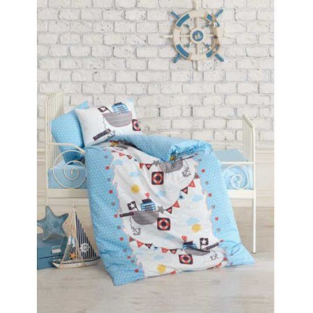 Комплект Gemici Mavi имеет голубую простынь и бело-голубой пододеяльник с корабликов с флажками и якорями.