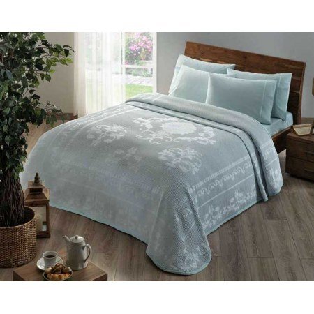 Модель Helena Su Yesil ментолово-зеленоватого цвета с выдавленным узором во французском стиле на покрывале. Предлагается с простынёй на резинке.