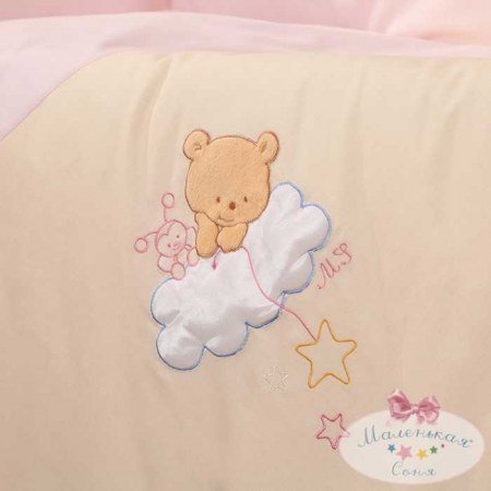 В комплект входит небольшая наволочка из однотонной светло-розовой материи, простыня на резинке кремового цвета и красивый пододеяльник, скомбинируемый из этих двух цветов, украшен объёмной вышивкой забавного мишутки с пчёлкой на облачке.