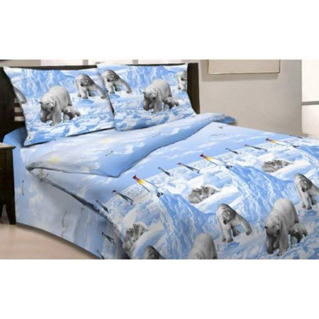 Комплект "Арктика" выполнен в спокойных нежно-голубых тонах с изображением арктических красот и белых медведей. Пошит из классической бязи, в состав которой входит 100% хлопок.