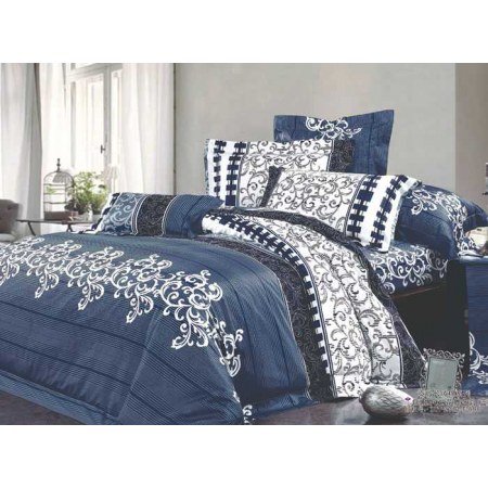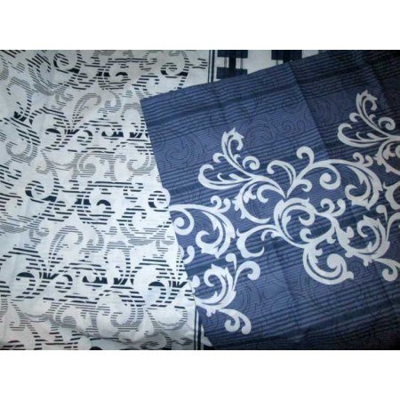 Изюминкой модели является глубокий синий цвет. Он настолько насыщенный, что больше походит на таинственный оттенок индиго. Выполнена в синюю мелкую полоску с красивыми вставками цвета индиго, украшенными узорами. Эти вставки обрамляют белую часть пододеяльника, создающего некий контраст с насыщенностью красок. Наволочки, также разрисованные чудесным узорчатым рисунком, повторяют верхнюю часть пододеяльника. Простоту узора рассеивает всё та же тёмно-синяя окантовка.