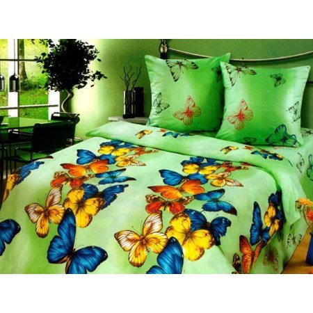 Комплект "Виолетта" выполнен в красочных зелёных тонах с изображением красивых порхающих бабочек. Пошит из классической бязи, в состав которой входит 100% хлопок.