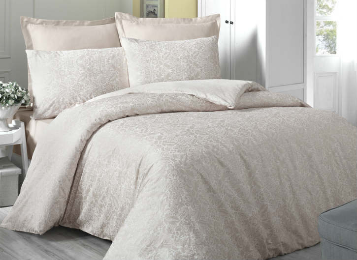 У комплекта Cream евро размера однотонная простынь кремового цвета. Пододеяльник такого же цвета со светлым узором.
