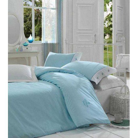 Комплект постельного белья Plain Turkuaz пошиты турецким производителем Cotton Box из однотонного ранфорса (100% хлопок) голубого цвета с эксклюзивной надписью и необычайно элегантными наволочками создаёт спальне неповторимую атмосферу спокойной размеренности и королевского величия.