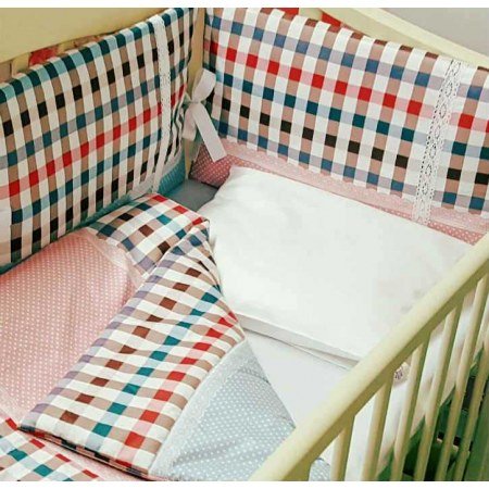 - бортик на кроватку - защита, состоящая из 6 раздельных частей, которые крепятся на завязки; на все 6 частей одеты хлопковые чехлы в тон постельного белья, их можно легко снять и постирать;