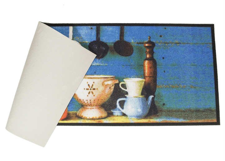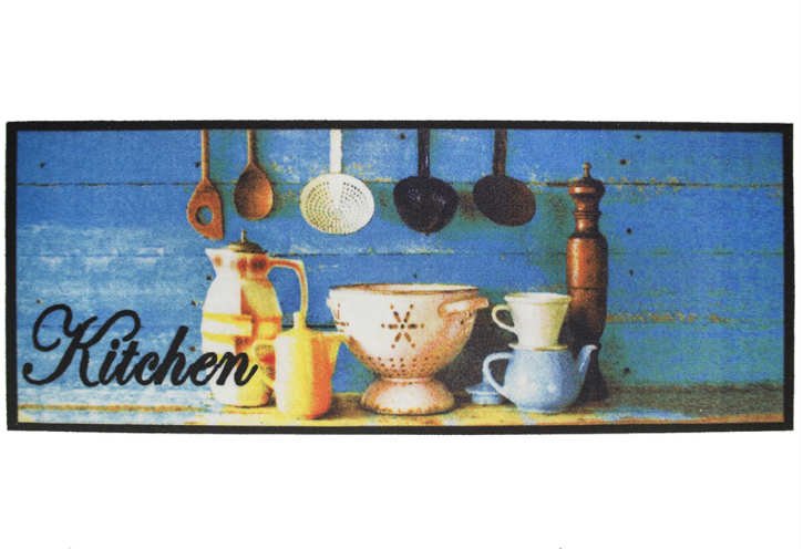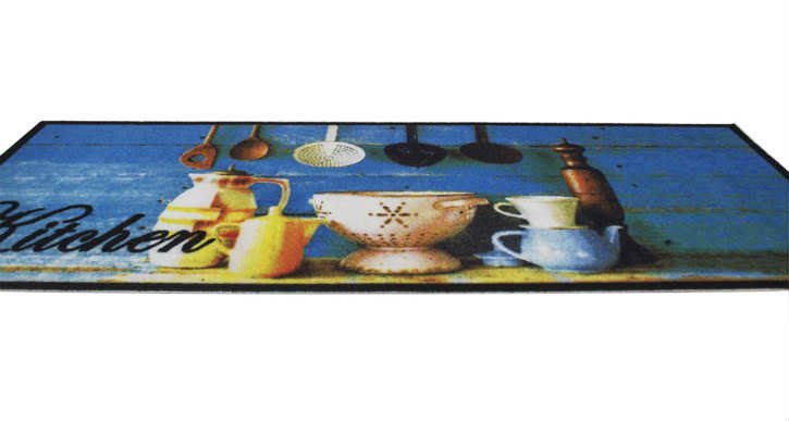 Модель Cooky Kitchenware с кухонным принтом в синих тонах. Подходит для использования как в доме, так и на улице или в летней кухне. Легко моется.