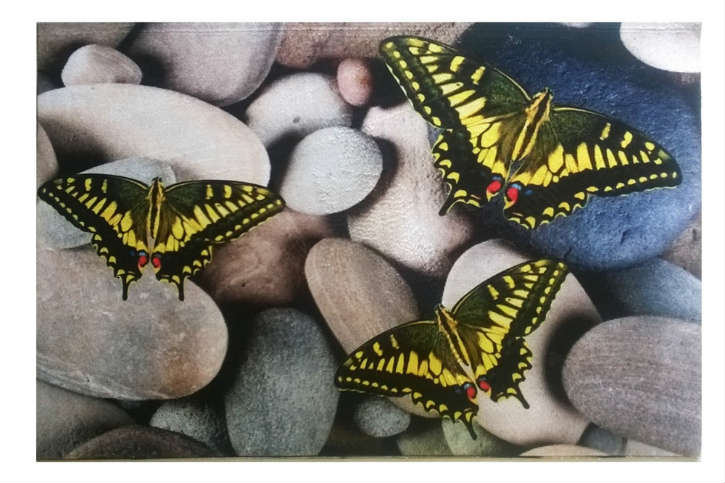 Модель Kitty Sari Kelebek выполнена в виде фотопринта с реалистичным изображением бабочек на фоне морских камней.