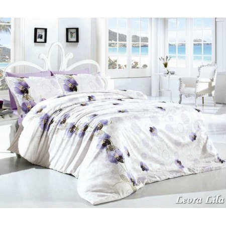 Модель Leora Lila представлена в белых и сиреневых тонах. Простыня и большие квадратные наволочки пошиты из однотонного полотна красивого фиалкового цвета. Узкие наволочки 50х70 см так же, как и пододеяльник, украшены орхидеями на белом фоне.
