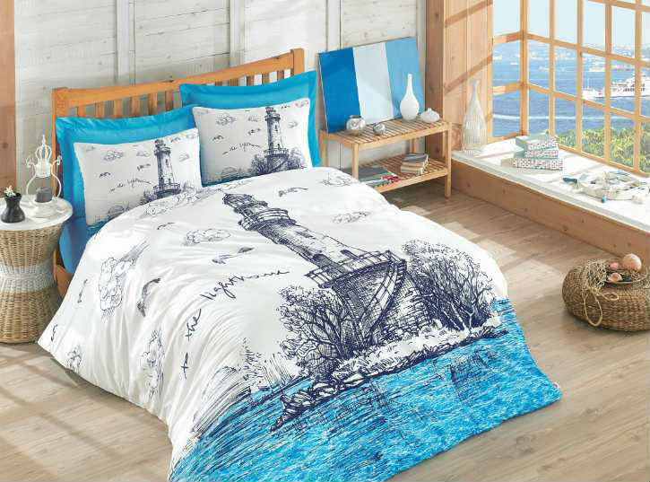 Модель Light House Mavi выполнена в белых и лазурных тонах с изображением маяка.