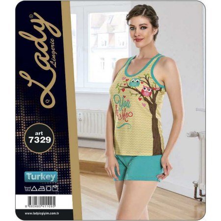 В набор входят весёлая майка с влюблёнными совами на фоне бежевых зигзагов и шорты бирюзового цвета.