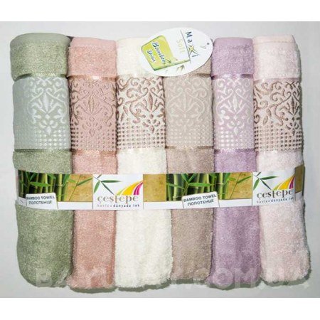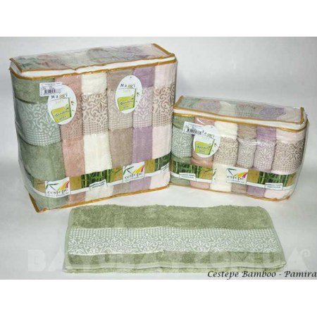Набор Cestepe Bamboo Pamira включает в себя 6 изделий с жаккардовым бордюром. Можно купить комплект для всей семьи или на подарок из шести единиц 50х90 см для лица или из шести больших банных полотенец 70х140 см.