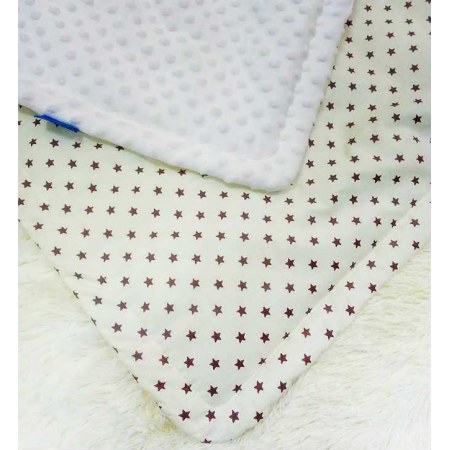 Модель Minky Stars двухсторонняя: с одной стороны изделие из натуральной хлопковой ткани с изображением мелких звёзд на молочном фоне, а с другой - мягкая плюшевая подкладка из польской ткани белого цвета.
