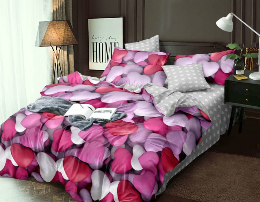 У 3д модели 250061 простынь и низ пододеяльника серые а верх с объёмным изображением красных и розовых сердечек.