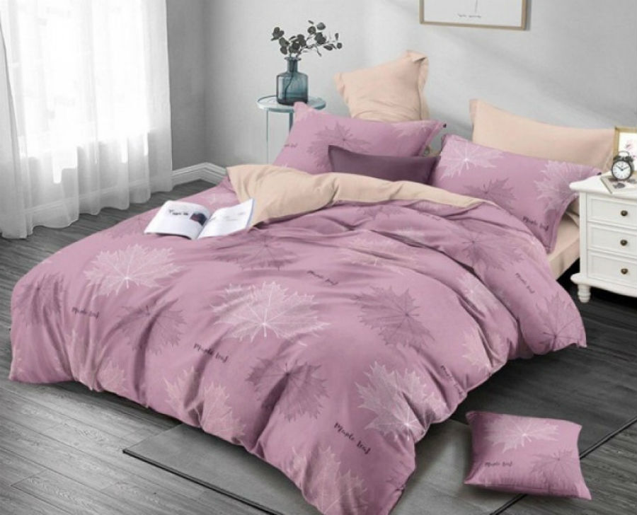 У модели ST292 простынь и низ пододеяльника кофейного цвета а верх сиреневый с кленовыми листьями.