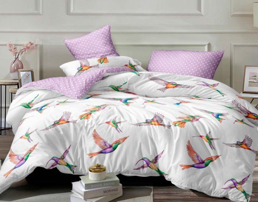 У модели ST302 простынь и низ пододеяльника сиреневые а верх белый с птичками колибри.